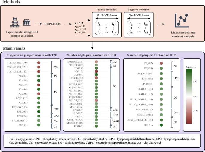 In a study published in Cardiovascular Diabetology, our team analysed the serum lipidomic profile of 513 individuals — 151 with type 1 diabetes (T1D), 155 with T2D, and 207 non-diabetic controls — all of whom underwent carotid ultrasound to assess SCA. Lipidomics is the systematic measurement of lipid species in a biological sample; instead of measuring total cholesterol or triglycerides, it profiles hundreds of individual lipid molecules with chemical specificity.